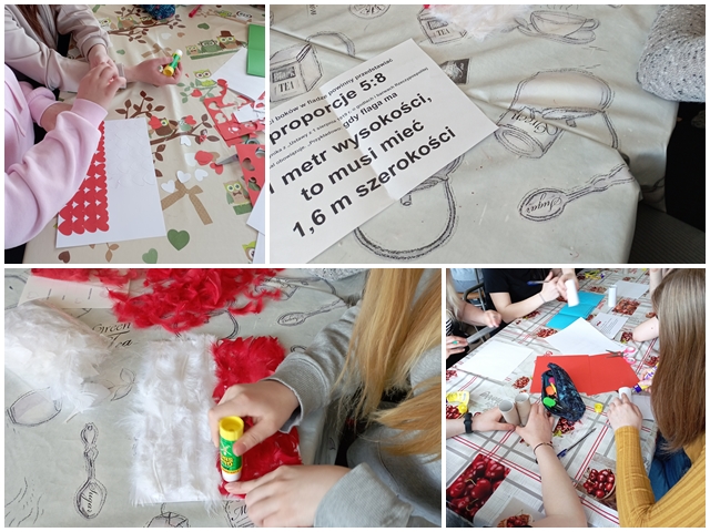 W „przerwie” między 1 i 3 maja w naszej placówce postanowiliśmy przypomnieć sobie, czym jest dla nas patriotyzm, co znaczą dla nas symbole narodowe oraz poznać atrakcyjne regiony Polski. Dziewczęta pracowały w grupach wychowawczych. Wszystkie otrzymały te same polecania, czyli miały wykonać flagę z wylosowanych materiałów (szyszki, rolki papieru, wycięte serduszka, piórka i zrolowane karteczki), napisać tekst hymnu Polski i zaprojektować ulotkę z propozycjami najciekawszych miejsc w naszym kraju.