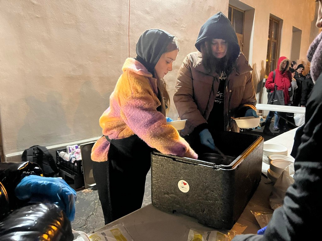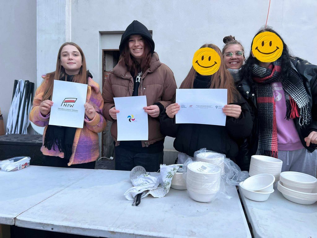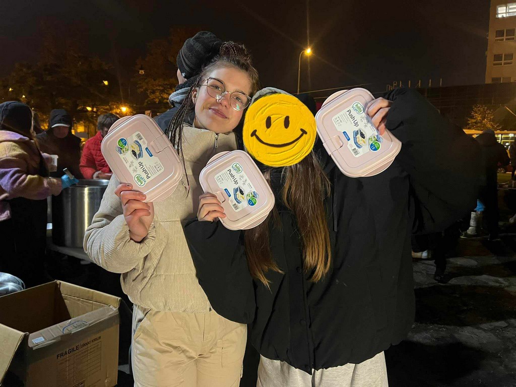 Następnego dnia, tj. 12.11.2023 r.,  dziewczęta wydawały posiłek i rozdawały najbardziej potrzebującym zakupione wcześniej kubki termiczne oraz pojemniki wielokrotnego użytku. Opakowania te pozwolą utrzymać wysoką temperaturę napojów, które bezdomni mogą pozyskać np, w Caritas, łaźni, dzięki czemu pomogą im przetrwać zimne dni. To z pewnością była cenna lekcja przedsiębiorczości dla naszych uczennic oraz niezły sprawdzian da naszej wrażliwości.